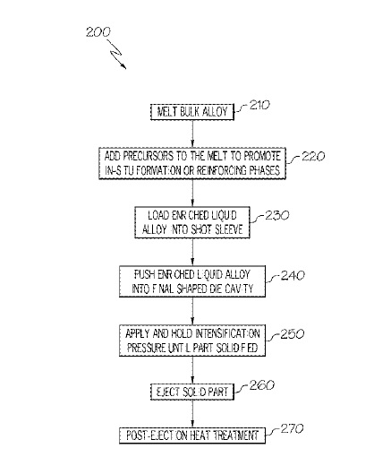 US9999921 — METHOD OF MAKING ALUMINUM OR MAGNESIUM BASED COMPOSITE ENGINE BLOCKS OR OTHER PARTS WITH IN-SITU FORMED REINFORCED PHASES THROUGH SQUEEZE CASTING OR SEMI-SOLID METAL FORMING AND POST HEAT TREATMENT — GM Global Technology Operations LLC (USA) — This invention relates generally to a method to make light-weight metal-matrix composite components through squeeze casting or semi-solid metal (SSM) forming, and more particularly to making such components from a reinforced metal matrix composite where the reinforcing phase or phases are generated in-situ during such casting or forming operations. A method of making a reinforced metal alloy component, the method including introducing a reinforcing phase precursor into a bulk alloy that is selected from the group consisting of high-entropy alloys, aluminum-based alloys, magnesium-based alloys and combinations thereof. The precursor is converted to a reinforcing phase by exposing the bulk alloy and precursor to an elevated temperature during one or more of a subsequent heat treating step, squeeze casting shaping, or semi-solid metal shaping.