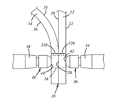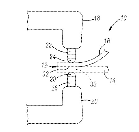 US10010966 — ELECTRODE FOR RESISTANCE SPOT WELDING OF DISSIMILAR METALS — GM Global Technology Operations LLC (USA) — A method of spot welding a workpiece stack-up that includes a steel workpiece and an aluminum alloy workpiece involves passing an electrical current through the workpieces and between welding electrodes that are constructed to affect the current density of the electrical current. The welding electrodes, more specifically, are constructed to render the density of the electrical current greater in the steel workpiece than in the aluminum alloy workpiece. This difference in current densities can be accomplished by passing, at least initially, the electrical current between a weld face of the welding electrode in contact with the steel workpiece and a perimeter region of a weld face of the welding electrode in contact with the aluminum alloy workpiece.